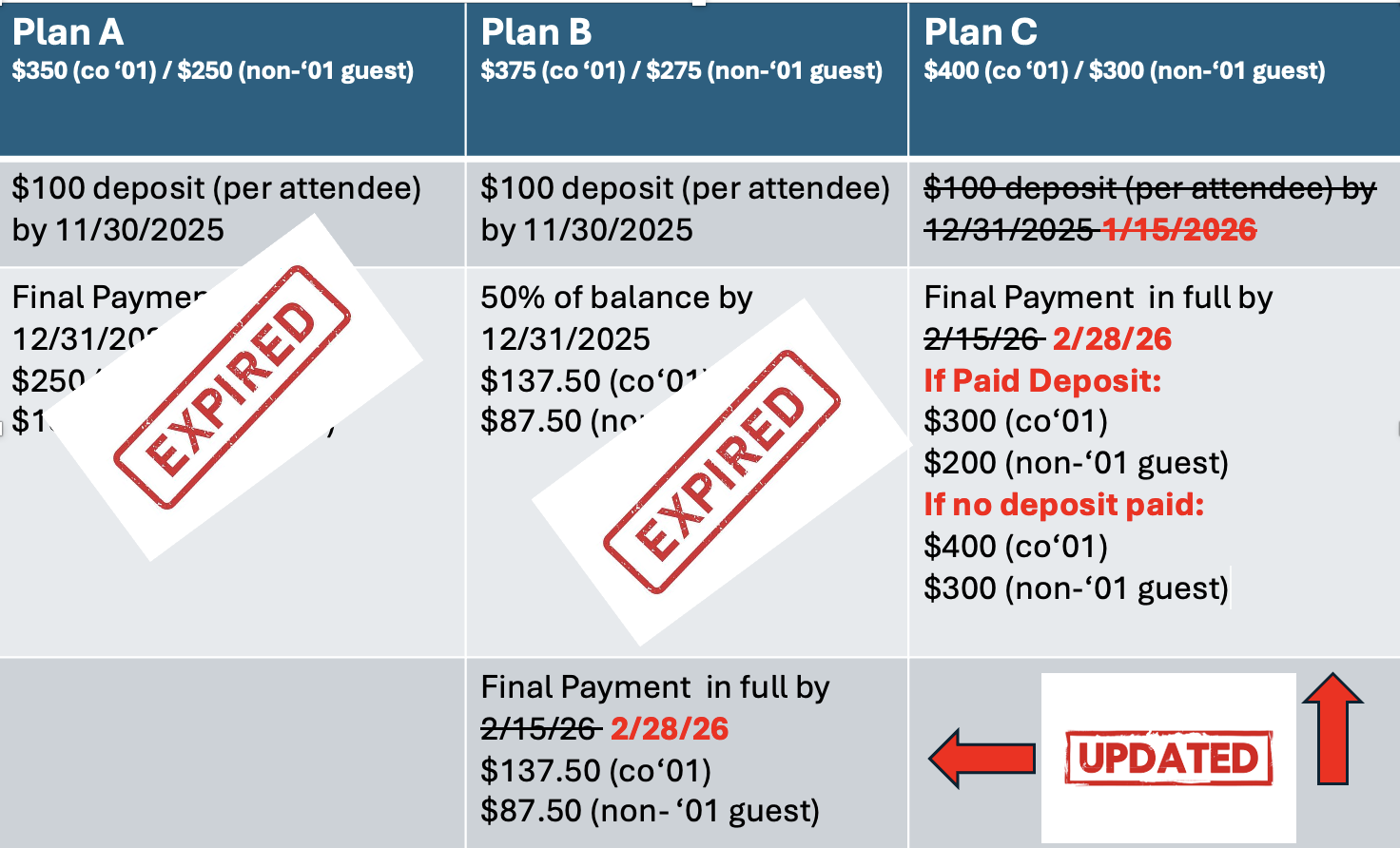 UPDATE: NO DEPOSIT REQUIRED FOR PLAN C. ALL DUES MUST BE PAID BY FEB. 28th.